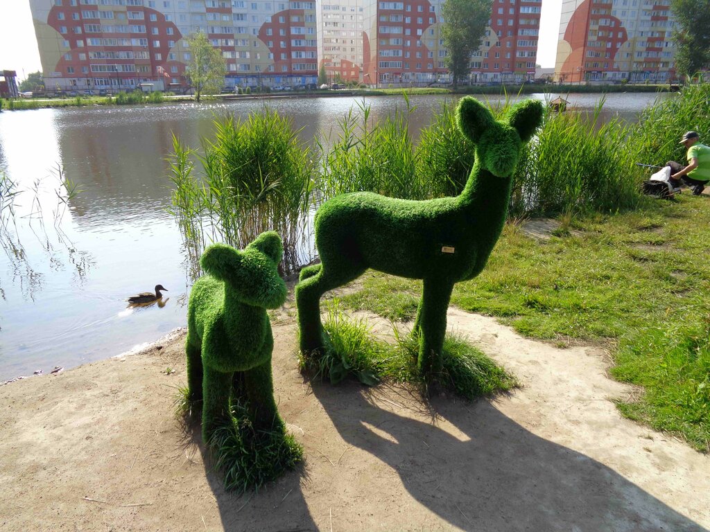Место возле пруда с хорошо выполненными скульптурами возле которых можно сделать хорошее фото.