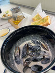Мидии, соус горгонзола (репчатый лук, растительное масло, чеснок, сыр горгонзола, сливки 33%), чесночный багет