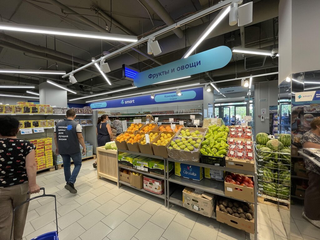 Удобно расположен в ТЦ Дюны . Площадь магазина маловата- стеллажи расположены близко, а если еще поставят паллеты,то тесновато. Набор продуктов стандартный для больших Смарт. хожу туда за свежим хлебом и фруктами. Бывают акции на товары, есть кассы самообслуживания. Хороший магазин.