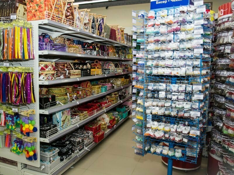Handicraft stores:tapes, fabrics, ornamentation, beads, yarn, thread, lace, paper, cardboard, packing, tools, soap base, polymer clay, molds for soap, dyes, flavors, shtamping, findings, plastic, epoxy resin, pencils