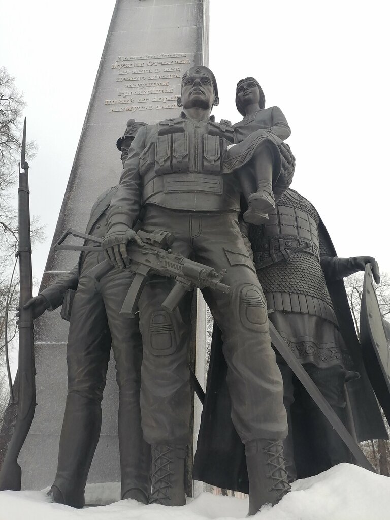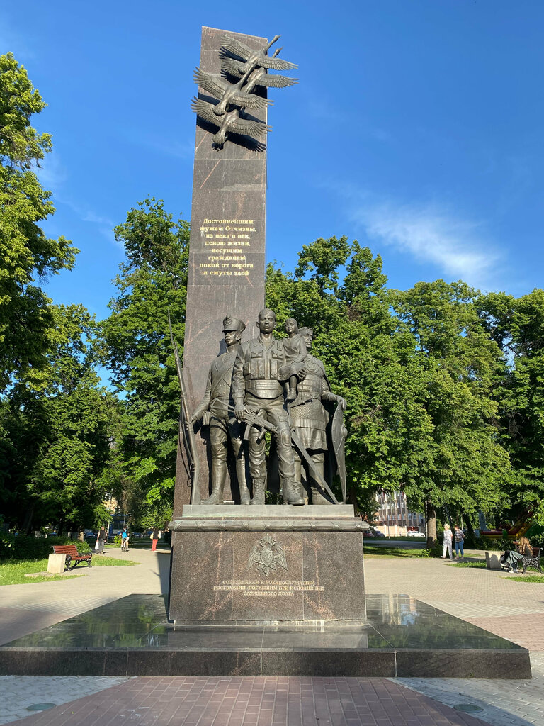 Патриотичное место!!! На памятнике можно увидеть росгвардейцев, ребенка на их руках и летящих журавлей. На скульптуре есть памятные слова. Все хорошо проработано. Советую этот объект!