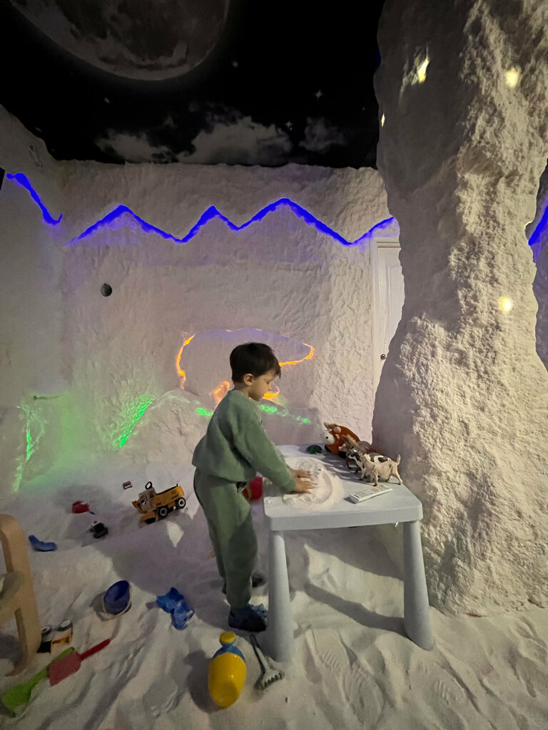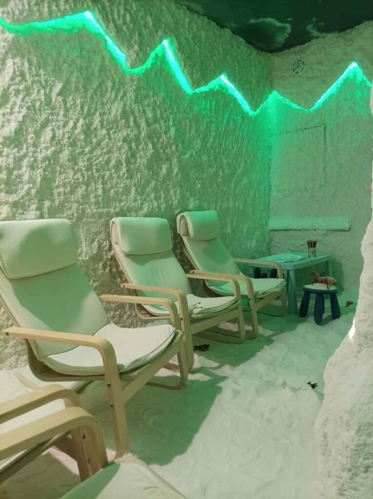 Маленькая комната где ребёнок может играть солью как в песочнице , есть игрушки , возьмите резиновые тапочки . На входе дают бахилы и шапочку и кроксы для взрослых . В комнате есть телевизор с мультиками и музыкой , есть 5 кресел . Удобно записываться и приходить всей семьёй . В течение сеанса галотерапии солевой воздух увеличивает насыщенность крови кислородом, формирует защитные силы организма для борьбы с инфекциями и вирусами. Соляные пещеры особенно полезны при лечении различных ЛОР-заболеваний: гайморитов, фарингитов и бронхитов.Поэтому мы будем ходить