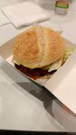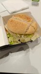 Обжаренная куриная котлета из сочного куриного мяса, панированная в сухарях, которая подается на карамелизованной булочке, заправленной свежим салатом и специальным соусом