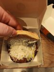 Рубленый бифштекс из натуральной цельной говядины с кусочками сыра Чеддер на карамелизованной булочке, заправленной горчицей, кетчупом, луком и кусочком маринованного огурчика