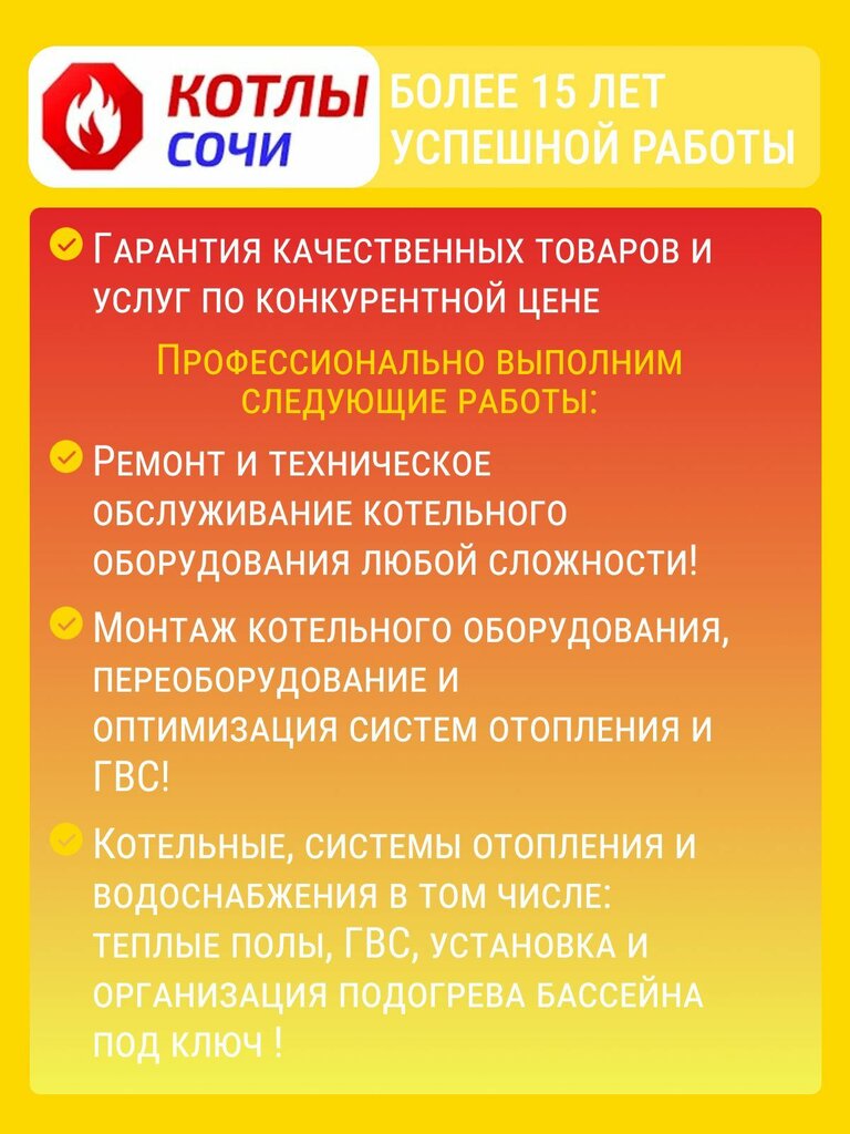 Сервисный центр «Сочи Котлы» — качественный сервис, запчасти, техническая документация и квалифицированные специалисты. Звоните, решим любые проблемы с вашим котлом: Профилактика и сервисное обслуживание. Специалист по ремонту газовых кот...