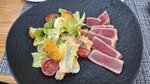 Тигровые креветки, груша, бекон, Пармская ветчина, микс салатов, томаты, грейпфрут, физалис, шампиньоны, соус Бальзамик.