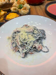 Приятное место. Зашли сюда пообедать после утомительного 🤣шопинга в Леруа. Мы были в субботу днем и к удивлению посетителей было немного. Нас обслуживал доброжелательный и очень обходительный официант, нам показалось, что он серб по национальности. На выбор предлагают 2 вида меню из итальянской и японской кухни. Мы заказали морской сет, пасту карбонара в черном исполнении, чай и десерты. Все очень понравилось, особенно морской сет ❤️ Ценник средний по Москве