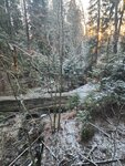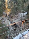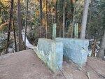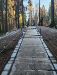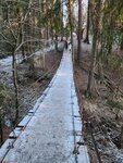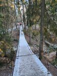 Подвесной деревянный мост на стальных тросах. При прохождении немного раскачивается, но, вроде, надёжный. При заморозках становится скользким, так что крепче держитесь за поручни.