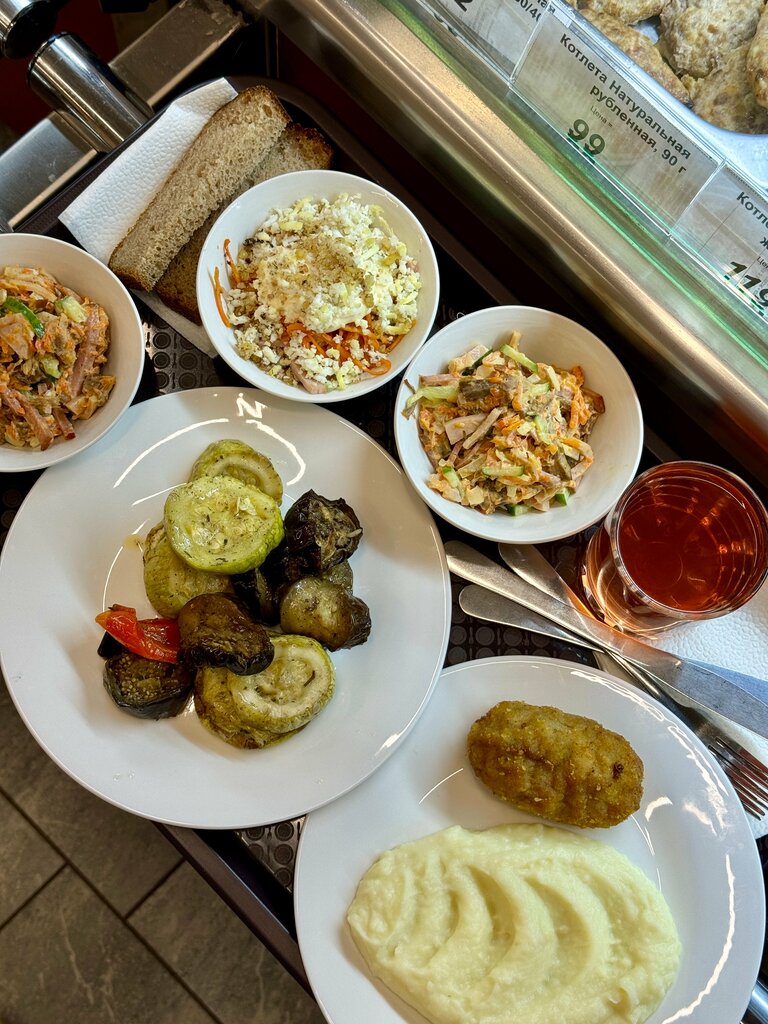 Чисто, уютно. Блюда конечно не большие, особенно супы в чашке почти. Но на 320 рублей: салат, суп, второе с мясом и компот можно получить. Если холодное или не особо горячее, по обе стороны есть микроволновые печи. Так же есть кофемашина, можно сделать себе заварной кофе. Очереди в час пик (13:00) особо нет. Столы и места , где «преземлиться» есть