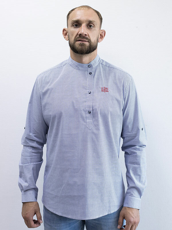 Легкая хлопковая ткань 98% хлопок, 2 % эластана. Вышивка «Иисус Христос НиКа». Воротник стойка, хлястики для закатывания рукавов, ластовица для укрепления швов по бокам низа. Принт мелкая клетка.