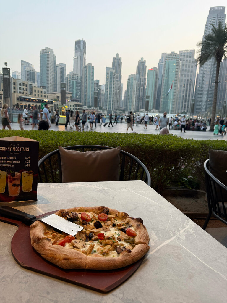 Very tasty, large and inexpensive pizza. You sit in front of the fountains and enjoy the view. It's a beautiful and comfortable place.