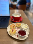 Интерьер - 5 Обслуживание и его скорость - 5 Вежливость - 5 Кофе - 3+, 4-Завтрак - 4-Цены - 2+, 3-Десерты - 4- В итоге решила поставить 4, поскольку общее впечатление приятное. Из десертов пробовали наполеон, медовик, пирожное картошку. Пробовали флэт уайт и капучино. Брали европейский завтрак и сырники. Европейский завтрак: много всего, но красная рыба была безвкусная, а авокадо было бы неплохо взять чуть более зрелое. Сырники были интересные, мне понравились, но знаю, что такие сырники на любителя - очень мягкие внутри, без вкуса ванили и почти не сладкие. За них ставлю 5++ 🔥 Кофе подают по температуре холоднее обычного, поэтому попросили заранее сделать погорячее. Десерты обычные. Капучино мне в первый раз не понравился - слишком молочный. А флэт уайт наоборот - слишком крепкий. Во второй раз капучино мне очень понравился и по температуре и по насыщенности вкуса. К ценам есть вопросы, но учитывая, что это почти единственное подобное место в Зашекснинском, наверно этим они и обусловленны. Вывод: за кофе и сырниками зайти можно, но нет гарантии, что в какой-то день капучино будет не слишком молочный)