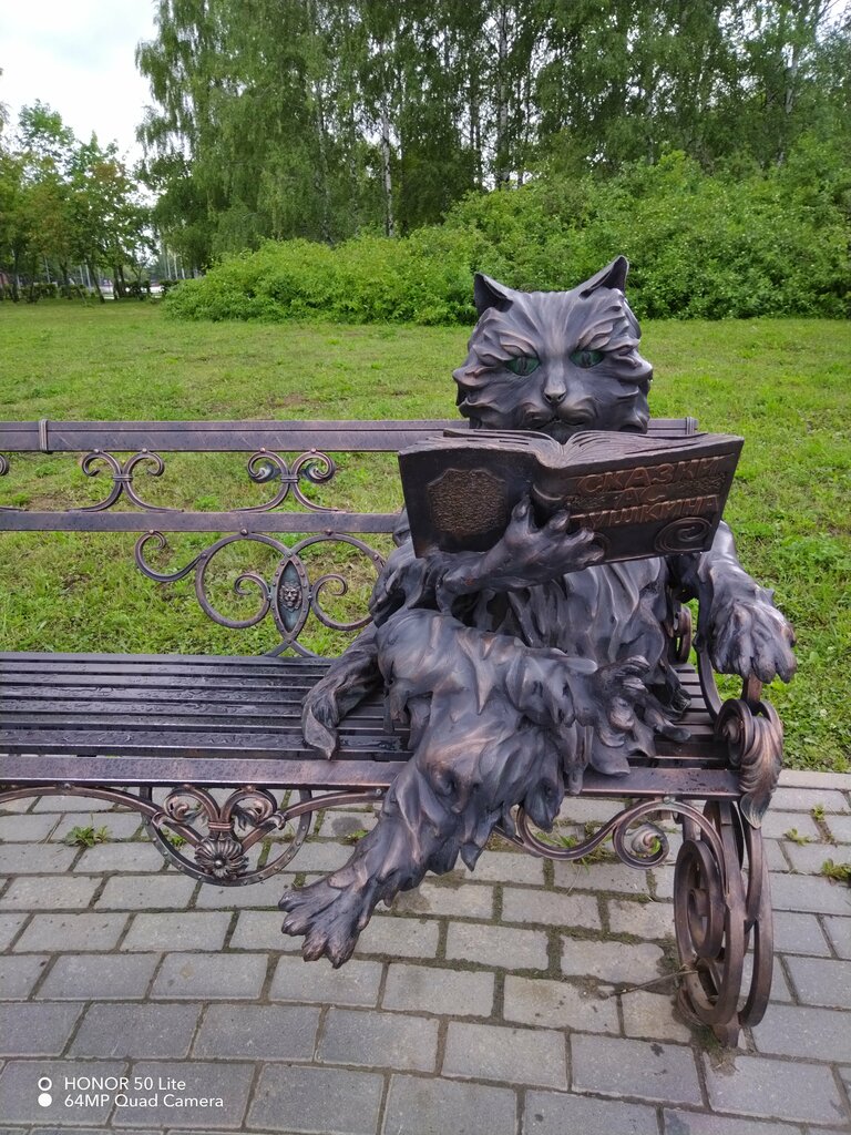 Кот учёный - восхитительное, уникальное, чудесное произведение Мастеров!!! Впечатлил меня и больше, если честно, мне представился кот Бегемот! И тот, и другой - весьма интеллектуальные персонажи и к тому же оба - черные коты! Очень рада была познакомиться с таким милым котиком! Скульптура расположена в парке на одной из площадок для отдыха. Очень приятное место с приятным и нужным посылом : стремление к знаниям и мудрости.