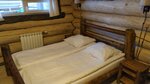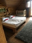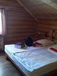 Очень понравился домик. С виду он такой невзрачный, зато внутри домика очень красиво, все в дереве. Вверху три спальни. В первой комнате большая двух спальная кровать, есть шкаф, так же душевая кабинка и туалет. Во второй комнате две кровати односпальные и так же есть душ и туалет. В третьей комнате ванна, двух спальная кровать, детская кроватка, терасса. На первом этаже одна изолированная комната с выходом на улицу. Туалет, кухня и большая гостиная с телевизором и двумя дивана и, один из которых раскладывается. Так же есть дополнительный выход на улицу с кухни, мангал, решетка. В домике очень тепло, полотенца, посуда, в принципе есть все для полноценного отдыха. Так же есть рыбалка и баня, но это платно.