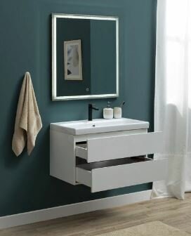 Корпус и фасады тумбы выполнены из влагостойкого ЛДСП и покрыты глянцевой белой эмалью. В конструкции тумбы использованы интегрированные ручки без острых краев и внутренних углов. Фарфоровая раковина Moduo производства компании Cersanit.