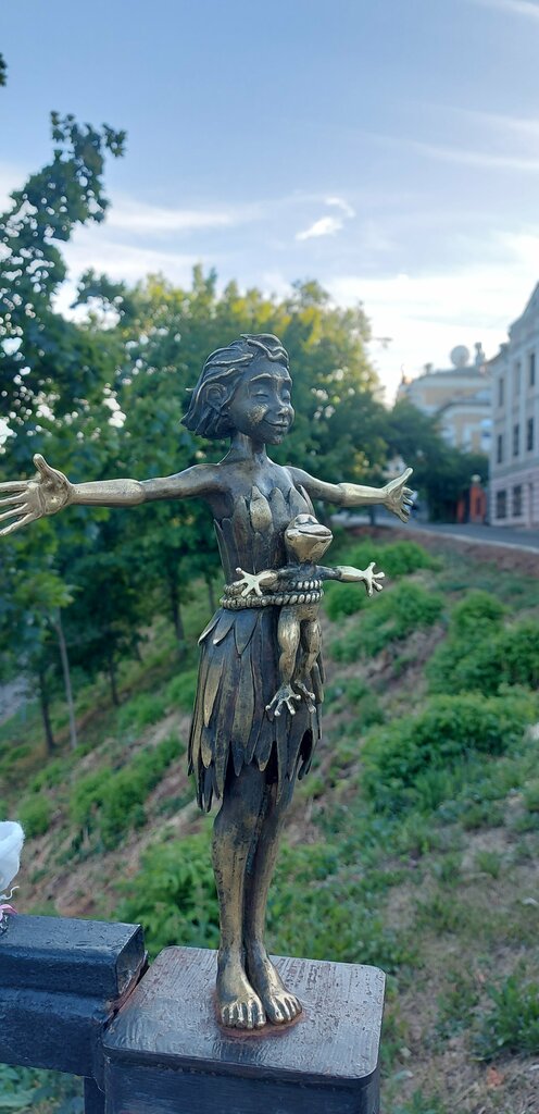 Симпатичная статуэтка. Находится на главной аллее, на второй скамейке слева. На карте обозначена в другом месте, пришлось искать.