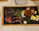 Тихое, уютное место. Очень приятный интерьер. Видно, что вложили душу. Но я за честный отзыв. Что касается кухни.. заказали винный сэт к вину. Мы конечно молча переглянулись, но никто не озвучил вслух.. тот момент, когда ты испытываешь испанский стыд. Позже, покинув заведение мы ради интереса зашли на сайт, дабы посмотреть как это должно было выглядеть.. (Фото нашего сэта прилагаю- да, тут мы успели умять 3 оливки и чуть вяленого мяса), А вот Филе миньон, нас порадовал. Было очень вкусно!
