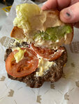 Приготовленный на огне бифштекс из 100% говядины, два нежных ломтика сыра, сочные помидоры, свежий нарезанный салат, густой майонез, хрустящие огурчики и свежий лук на нежной булочке с кунжутом