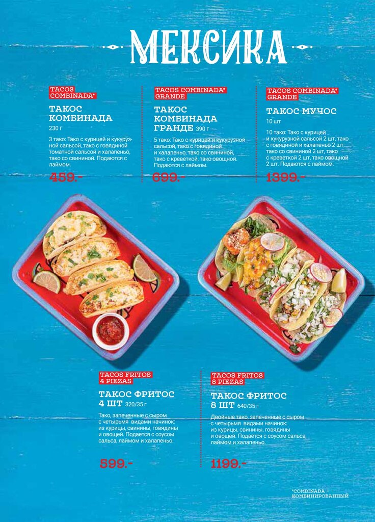 Тако в мягкой тортилье: тако с креветкой (2 шт.), тако с говядиной и халапеньо (2 шт.), тако с курицей (2 шт.), тако овощной (2 шт.), тако со свининой (2 шт.)