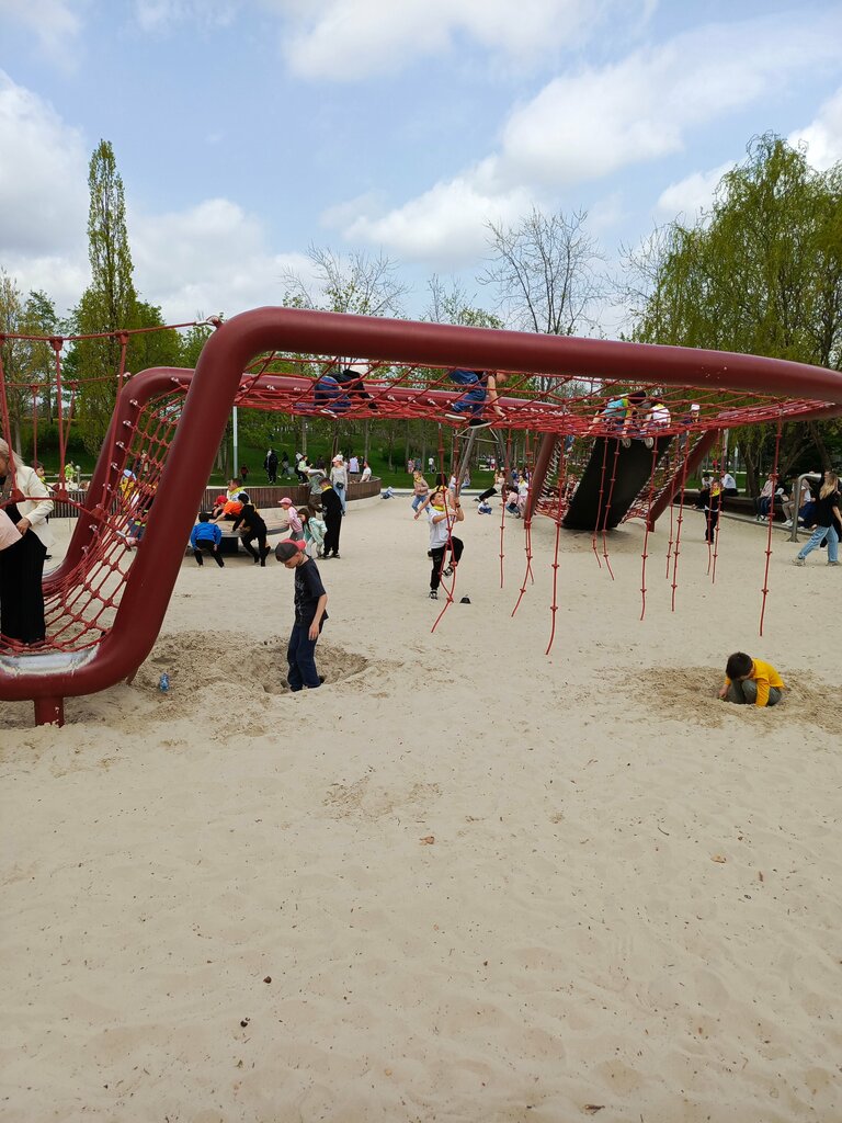 Большая " песочница", я бы так охарактеризовал эту детскую площадку, две маленькие горки , трое качелей и лазилка , рядом есть фонтан и хороший скейт парк