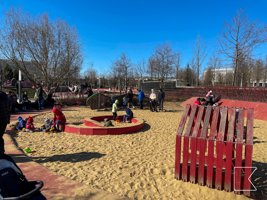 Хорошая детская площадка, оформлена в красном цвете, дополняется дальше спортивной зоной в том же цвете «по нарастающей» - от более детских и подростковых активностей, к «взрослым»: стритболу, настольному теннису.