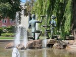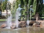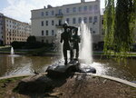 Фонтан украшен изящными фигурами парня и девушки,рядом Красный костел и колокол «Нагасаки».всн это находится в небольшом парке. На сой взгляд,одно из красивейших мест Минска