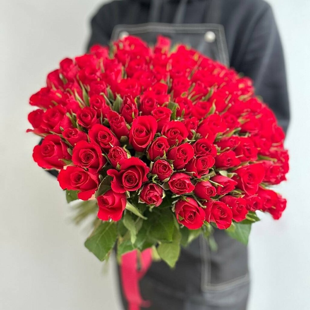 Состав: 101 роза Кения Информация о товарах и доставке *Внимание! Все товары, представленные на сайте являются демонстрационными. Мы оставляем за собой авторское право определять конечный состав букета с учетом сезонности цветов. Обещаем, что буке...