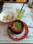 Столовая на четверочку. Конкурент Му-му, только с обслуживанием. Есть открытая терраса, найти место в выходной не проблема. Достаточно уютно, милые скатерти, симпатичный дизайн. Если ненадолго зайти поесть простой еды: борща, котлеток с пюрешкой - вряд ли разочаруетесь. Рассчитывать на что-то большее не стоит. К примеру плов сделали отвратительный, куски непонятного мяса в рисовой каше. Коктейли - тоже не их конёк.