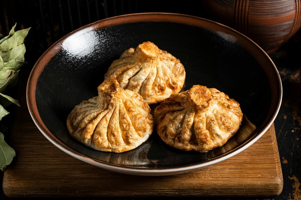 Жареные хинкали с начинкой из свино-говяжьего фарша с добавлением лука, кинзы, петрушки, укропа и грузинских специй (3 шт.)