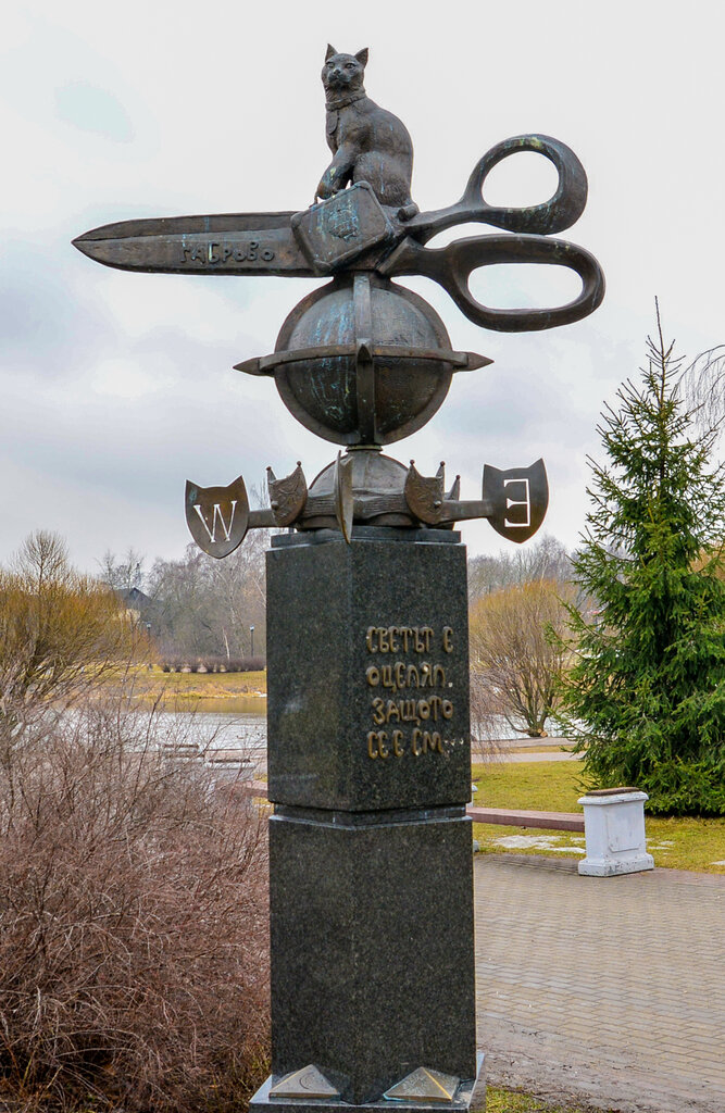Эта скульптурная композиция была установлена в мытищинском парке в 2013 году, в честь 10-летия установления партнерских связей с городом-побратимом. Габровцы славятся своим юмором, и кошка с ножницами символизирует один из местных анекдотов. Якобы, кошкам специально отрезали хвосты, чтобы они быстрее пробегали в дверь и не выпускали тепло.