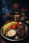 Сочная мраморная говядина, хрустящая пекинская капуста, пикантный крымский лук, маринованный огурец и розовый помидор — всё завернуто в пшеничную лепёшку. Соусы барбекю и сырный добавляют блюду насыщенности и глубины вкуса