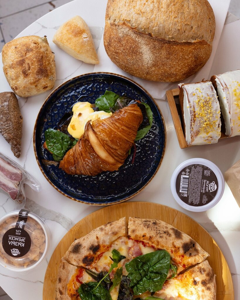 На пшеничной закваске. Готовится 3 дня, перед выпеканием ферментируется.Замешивается из локальных продуктов и муки высшего сорта (ржаной и цельнозерновой) с добавлением клюквы и тыквенных семечек.