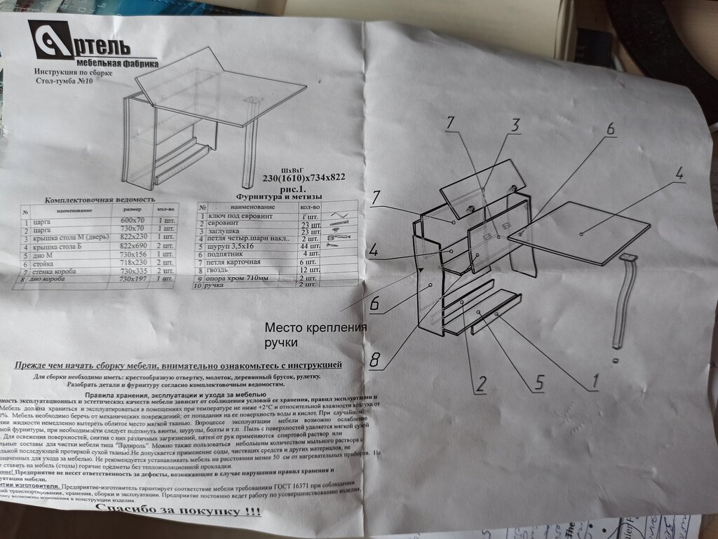 Приобрели изделие фабрики "Артель": "Стол-книжка Откидной №10 дуб молочный, 161х82х74 см" через Озон. Стол нужного нам оттенка и нужного нам дизайна, спасибо. На этом плюсы закончились, началась сборка. ОТВРАТИТЕЛЬНАЯ "инструкция по сборке". В сущности, это просто перечень деталей. Так называемая "инструкция" прилагается. Мне было очень приятно из нее узнать, что деталь 1 называется цанга. Но мне было бы гораздо приятнее получить пошаговое описание ("Шаг1: деталь 1 совместить с деталью 3", и т.д. Производитель ДАЖЕ НЕ ПОТРУДИЛСЯ разметить точки крепления петель, подпяточников и "опор хром".) А хуже всего было общение с производителем. Мы связались с мебельной фабрики Артель, в надежде получить более подробную инструкцию или хотя бы совет по сборке. Сперва человек именем Александр, указанный на сайте фабрики как контактная персона, отрекся от какой бы то ни было причастности к товару ("Мы? Его производим? А вы уверены? вы у нас покупали? На Озоне? Мы с Озоном не сотрудничаем!" - учитывая, что Озон продает не один предмет мебели, произведенный "Артелью", странно, что представитель фабрики понятия не имеет о своих дистрибьюторах), хамски и оскорбительно обсмеял намерение собрать стол самостоятельно (я всегда собираю самостоятельно несложные предметы мебели и ничего странного или постыдного в том не вижу); похихикал над запросом "нам нужна пошаговая инструкция по сборке", поделился историями из своей, очевидно, кому-то, но не нам интересной биографии ("когда я мальчонкой был, мне батя говорил: берешь молоток..."), ни пошаговой инструкции, ни объяснений не предоставил; разговор произвел крайне тягостное впечатление (фабрика ни за что не отвечает, еще им инструкция понадобилась! сами бестолковые!). Потом второй представитель фабрики, чей контакт представлен на сайте (дева с кокетливым именем "Алинка-Малинка" - и да, ссылка взята с сайта фабрики, не то, чтобы мы пришли в ее личный блог) долго объясняла, что, оказывается, за инструкцию по сборке отвечает дистрибьютер, а никак не фабрика ("Вы купили на Озоне? вот у них и спрашивайте! и у нас так много торговых площадок, мы прям даже и не знаем, кто и что продает. Товар пришел с браком? обращайтесь к Озону!"). Никому не порекомендую иметь дело с данным производителем впредь. Если мне понадобится какой-то еще предмет мебели, отсылка на "мебельную фабрику Артель" будет индикатором "не куплю".