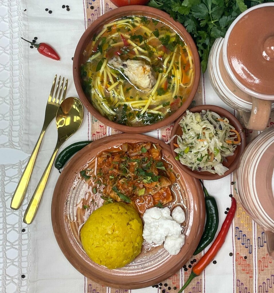 Полноценный обед за 80 лей включает в себя суп (350 мл) и второе (100 гр мяса и 200 гр ганира) 4 кусочка хлеба чиабатта и приборы
