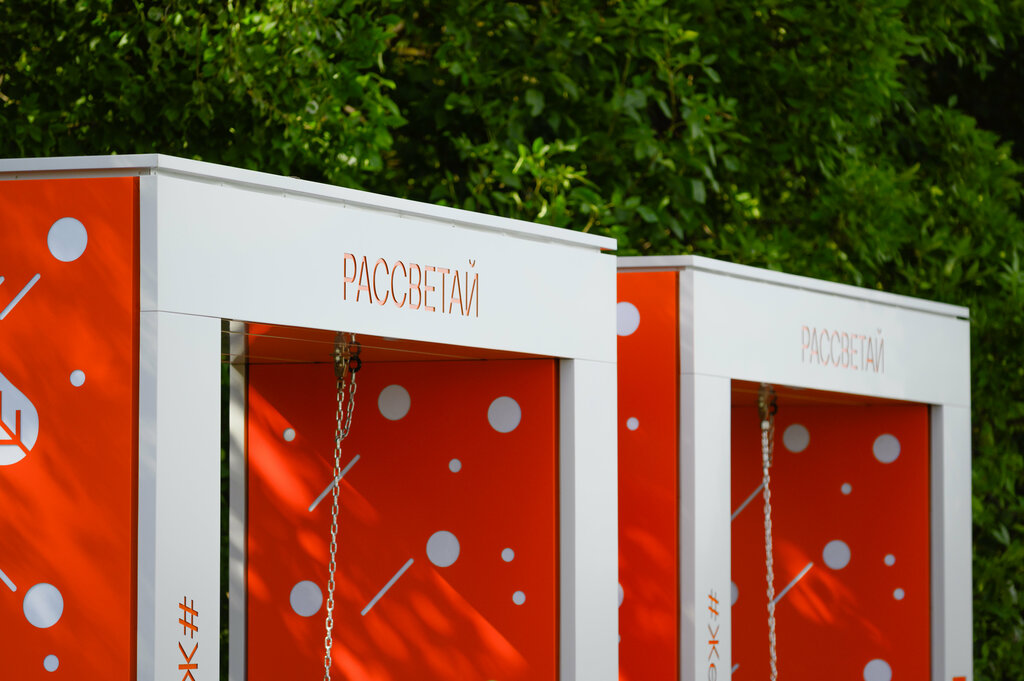 Качели раскачиваются внутри больших объёмных фируг, по своей форме напоминающих букву П. Над головой получается небольшая крыша, можно даже спрятаться от дождя. Качаются все неспешно, по утрам, когда солнце восходит из-за реки, можно загорать. А к 10 - 11 часам уже приходит тень. Даже летом.