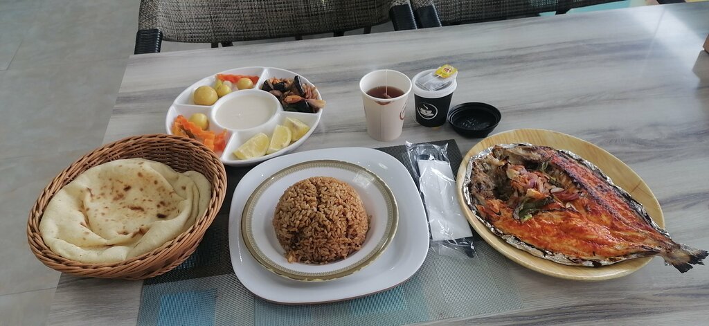 It's a decent enough, authentic, undistinguished place. There is a menu in English. The English-speaking waiter. I pointed to a line on the menu, and they took me to an iced chicken stand with fresh fish. The waiter showed which line of the menu corresponds to which fish. There are about 10 different species of fish. From 25 aed to 40 aed for a set combo lunch, depending on the type of fish. The fish are big. I pointed at the dorado in the window, and the waiter took it and handed it to the kitchen. I waited about 10 minutes for cooking. While I was waiting, I asked for tea. The tea was brought by a deliveryman, apparently from a nearby coffee shop. At first he brought a small glass of tea, but then the deliveryman returned and brought a large glass of tea. The waiter apologized and said that he had forgotten that Russians drink tea with glasses. The tea was sweet by default.