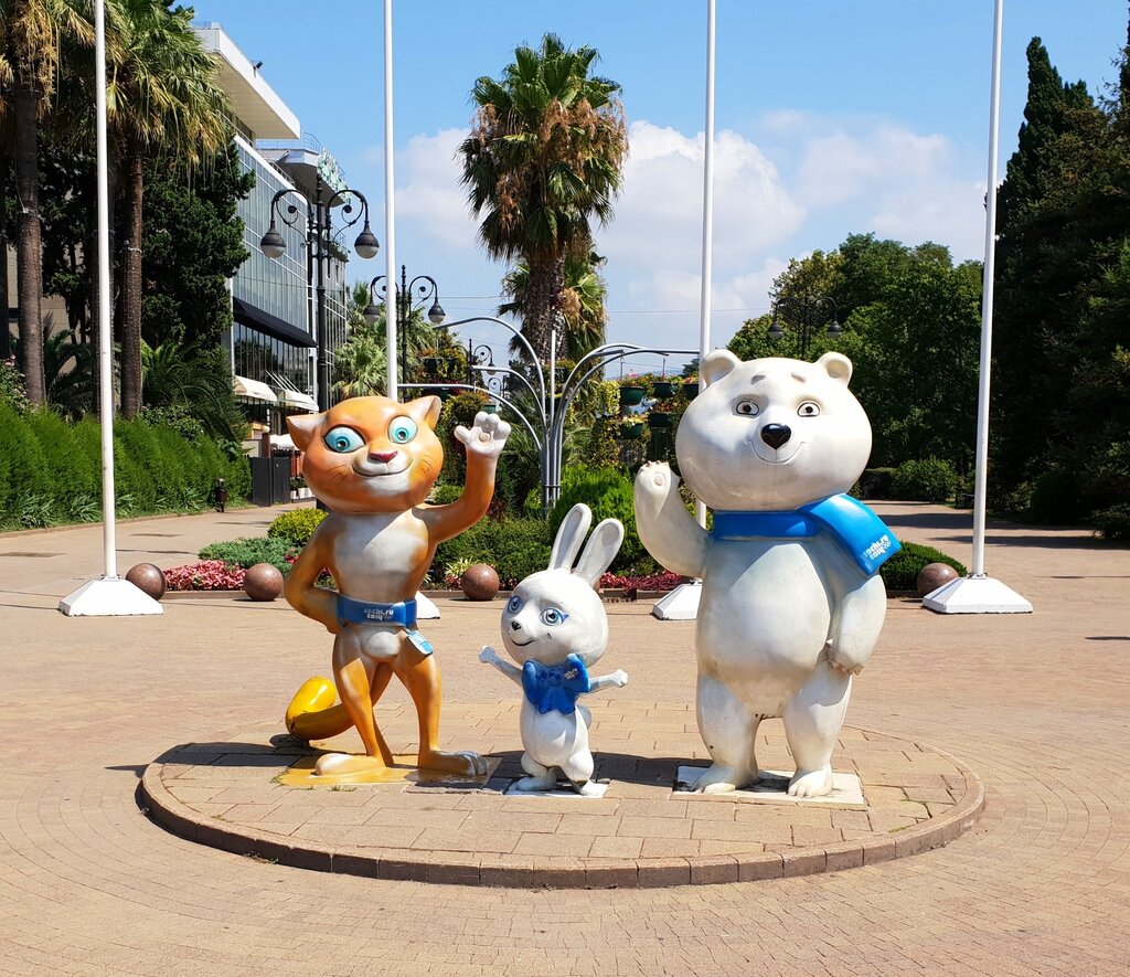 Милые и симпатичные фигурки-символы зимней олимпиады 2014 года в Сочи. Находятся недалеко от автобусной остановки "Платановая аллея" в начале прогулочной зоны по улице Навагинской. Место для красивых фотографий. Сейчас около фигурок находится светящаяся арка.