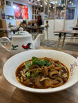 The staff is generally polite and diligent, but the atmosphere of the establishment is more like an inexpensive eatery. The noodles are cooked by themselves, which is a plus, but it tasted like an ordinary lagman. I ordered the most popular noodles with beef stew: the meat is really delicious, but its portion is small. The broth seemed just spicy and soy-flavored, with a noticeable amount of pepper, without a bright flavor balance, and there were clearly not enough vegetables. The price per serving is 66 thousand, the waiting time is 15 minutes, as a result, the impressions were average.