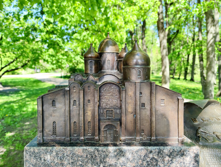 Интересная историческая справка, оформленная в виде рельефной медной карты. Расположена в парке, непосредственно под стенами Новгородского кремля, поэтому актуально и занимательно, особенно для детей)
