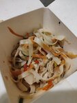 Лапша WOK большой недовес-заявлено 415 гр. В итоге вес с коробкой 354 гр. Соуса в лапше не чувствуется от слова совсем. Овощей, практически не видно, несколько кусочков шампиньона видео. Курица варёная резиновая. Блюдо сковороды не видело, тупо вареные макароны.