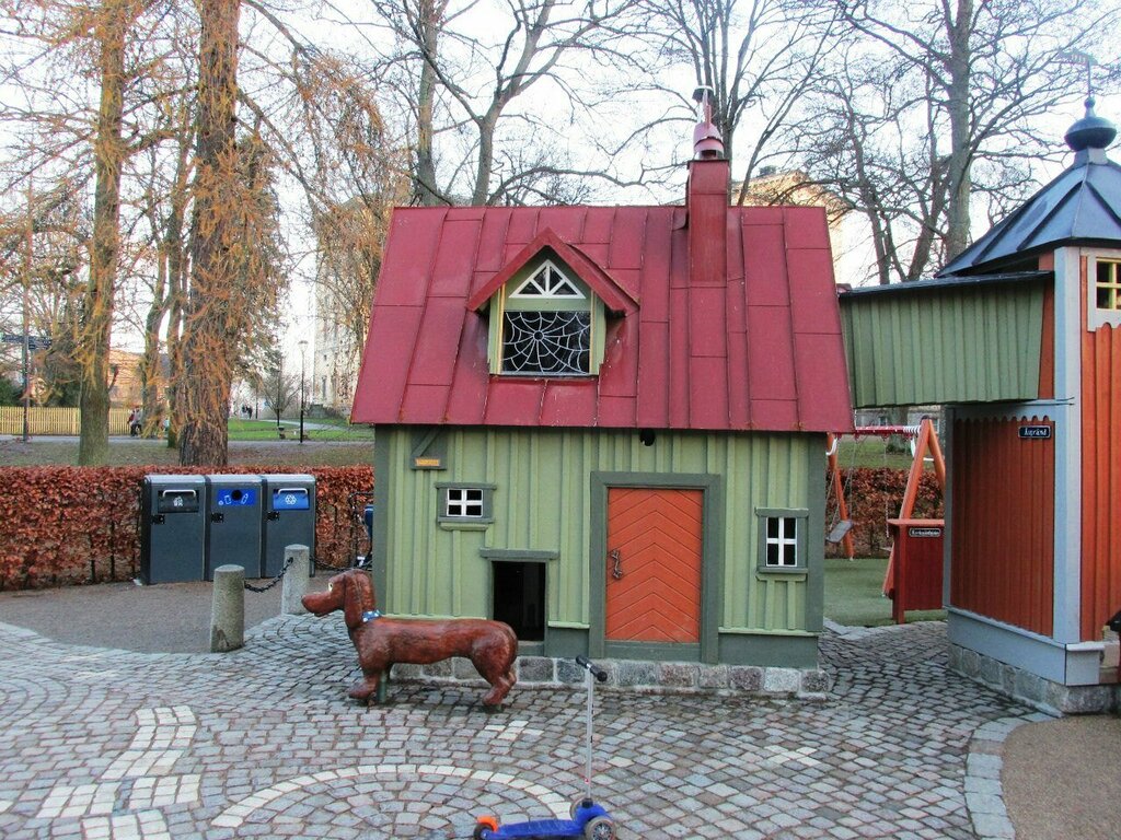 Children's playground of the Tailless Pelle in the English Park. Tailless Pelle is a favorite character of Swedish young children. It was invented by the writer Josta (Gustav) Knutsson (1908-1973), who wrote 30 books about Pella (only some of them have been translated into Russian). The playground was opened on the 75th anniversary of the publication of the first book (it was published back in 1939). The books are geographically linked to the central districts of Uppsala, so for young children, a special bureau conducts summer tours of the places of life of Pelle and his friends. Pelle is extremely popular in Uppsala, which is difficult to relate to a very simple children's story. There is a bronze sculpture of a Tailless Pelle in the city garden, and toys depicting it are sold in stores. Pelle's prototype was Knutsson's own tailless cat, as well as himself, Pelle's girlfriend Maya Creamy Nose portrays Knutsson's wife Erna. The cats from the fairy tale were the prototypes of Josta's friends. Only the main villain of the tale, the Evil Mons, and his henchmen include features of Hitler and Mussolini. The site recreated the Pelle house in Osgren Lane and the Mons house in Gropgren Lane (the alleys are real, although stone ones have already been built instead of wooden houses), the police station, Mrs. Rottstrom's pastry shop, the cathedral and other places described in the fairy tale.
