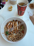 Лапша пшеничная, морковь, красный лук, паприка, цыплёнок кацу, кунжут, ростки бобов арахис, кинза, соусы сладкий чили, унаги, Yoda basic, BBQ
