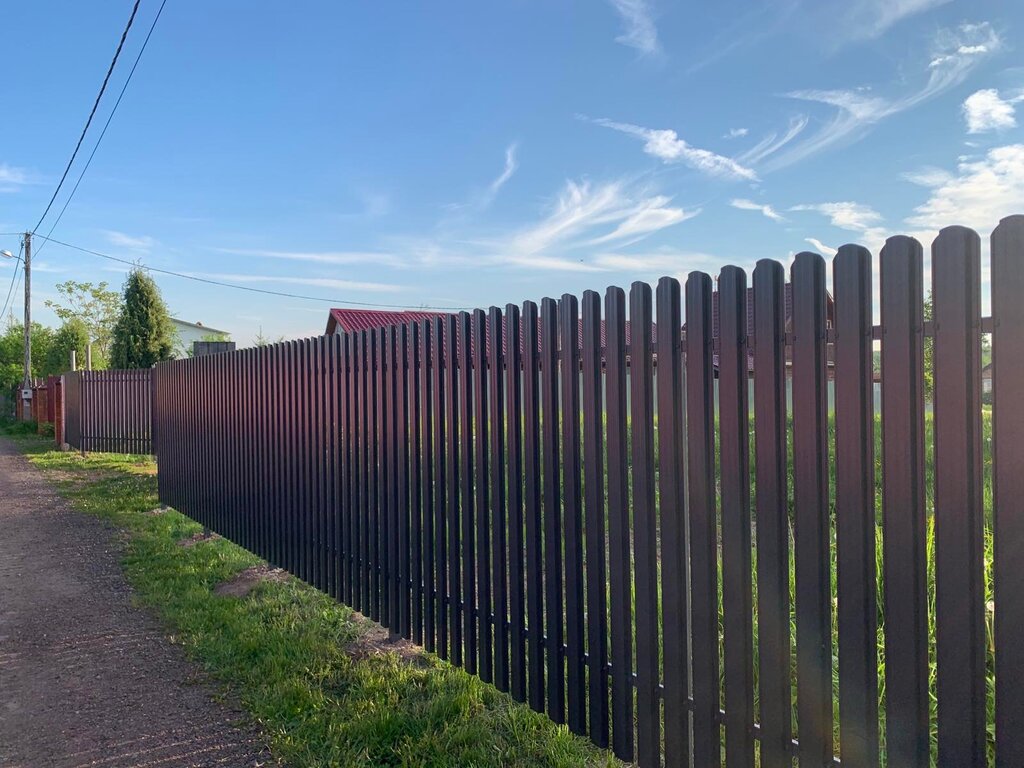 Забор из металлического штакетника с двухсторонним полимерным покрытием. Форма штакетника М и П - образный. Зазор между штакетинами 3 - 7 см. Высота забора 1,5 - 4 метра. Толщина металла 0,5мм. Собственное производство. Только российский металл.