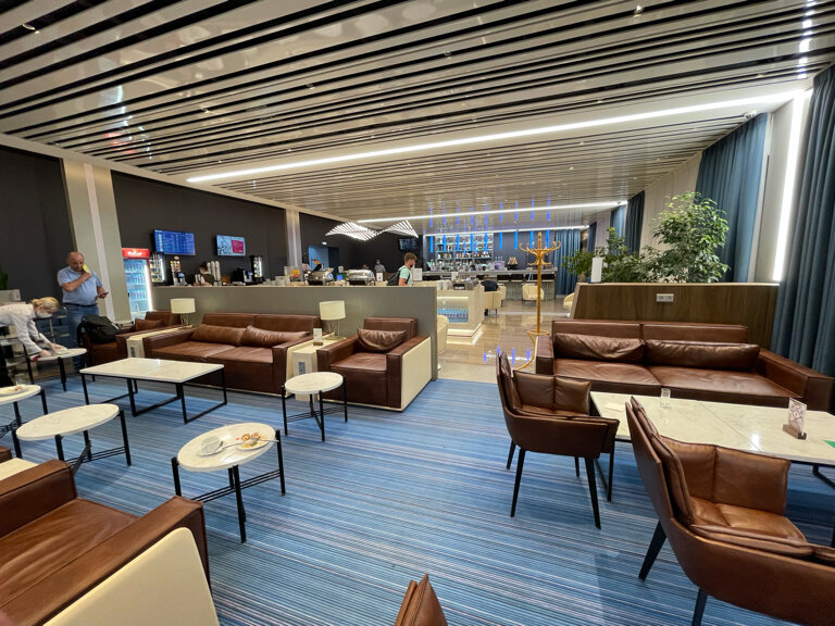 Неплохой зал. В часы пик может быть забит (как и ресторан этажом ниже), тогда приоритет прохода отдают пассажирам бизнес-класса. Им же безлимитное пиво, другим — по приветственному бокалу. Еда - ок.