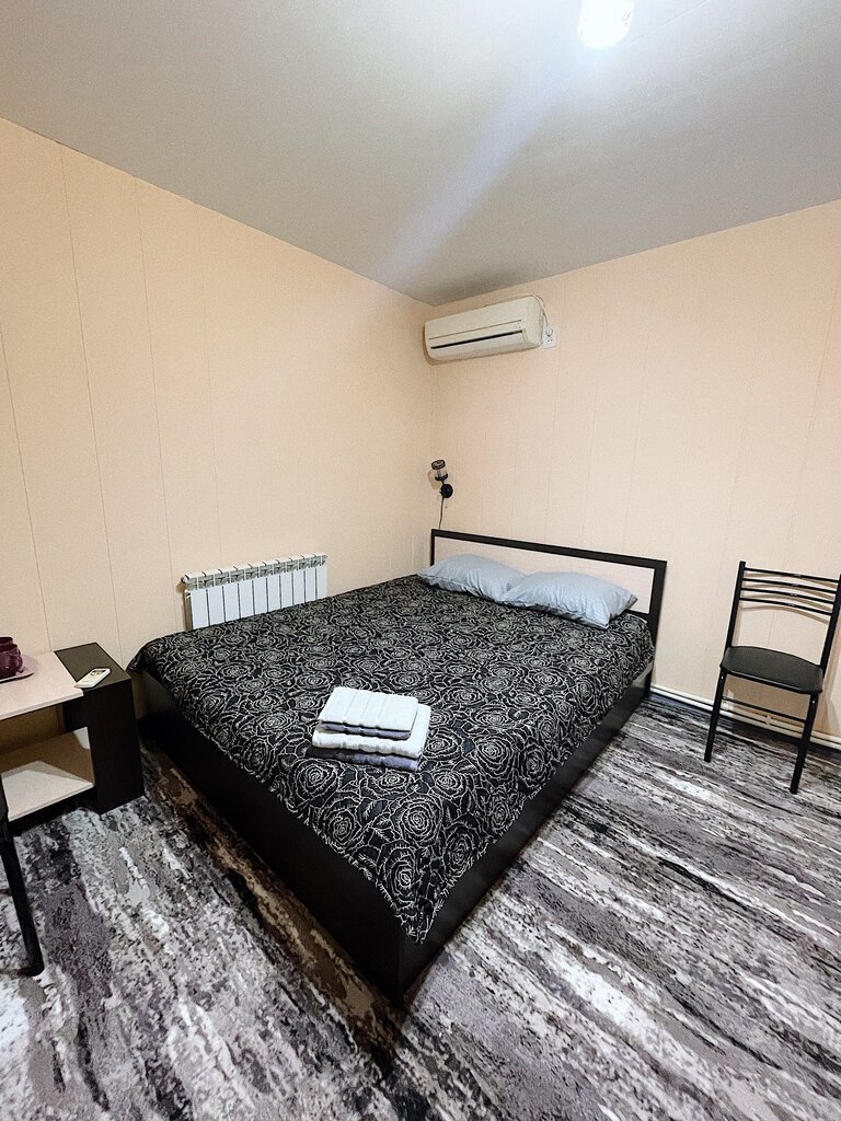 Это не гостиница, а гостевой домик с одним номером. 2 большие кровати, кондиционер, столик с чайником, чашки, чай, душ, унитаз, раковина. Очень чисто. Радушный хозяин, заселил без предоплаты. Все любезно показал. На этом плюсы закончились. К сожалению, близость трассы сказывается. Уснуть не возможно. Даже после 13 часов за рулём, уснуть не могла. Душно и шумно. Но может я такая чувствительная, ребенок 5 лет уснул сразу, 7 летний тоже не мог. Но хотя бы полежать, вытянуться, отдохнуть вариант хороший.