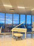 Светлый зал с панорамными окнами, украшенный белоснежным роялем, создает атмосферу изысканной элегантности.