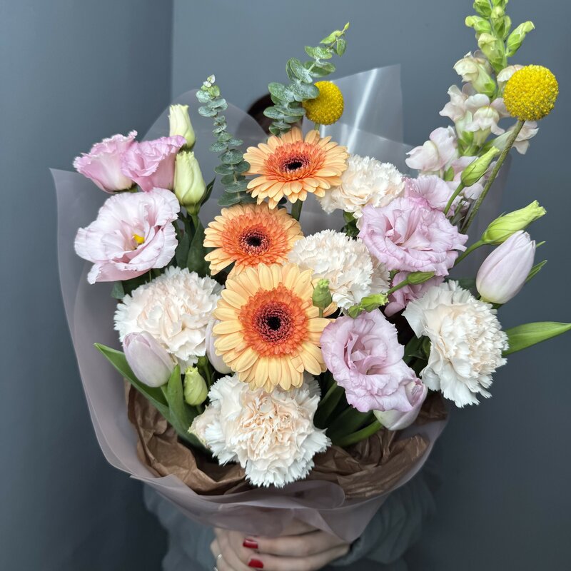 Состав: Разноцветные герберы, 13 шт. Писташ Крафт-бумага Атласные ленты Размеры: Высота, 40 см Ширина, 30 см