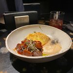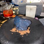 Угольный карпаччо из говяжьей вырезки под ореховым соусом и сырной шапкой из пармезана