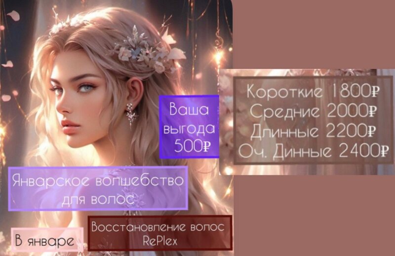 Hairdressing services:keratin straightening, toning, complex coloring, dyeing, highlights, modeling