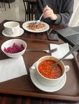 Это кафе - столовая. Цены приемлемые, готовят вкусно и девочки стараются. Как правило здесь на выбор 3 первых блюда и выбор из горячего и гарниров, салаты и напитки тоже присутствуют. За чистотой следят.